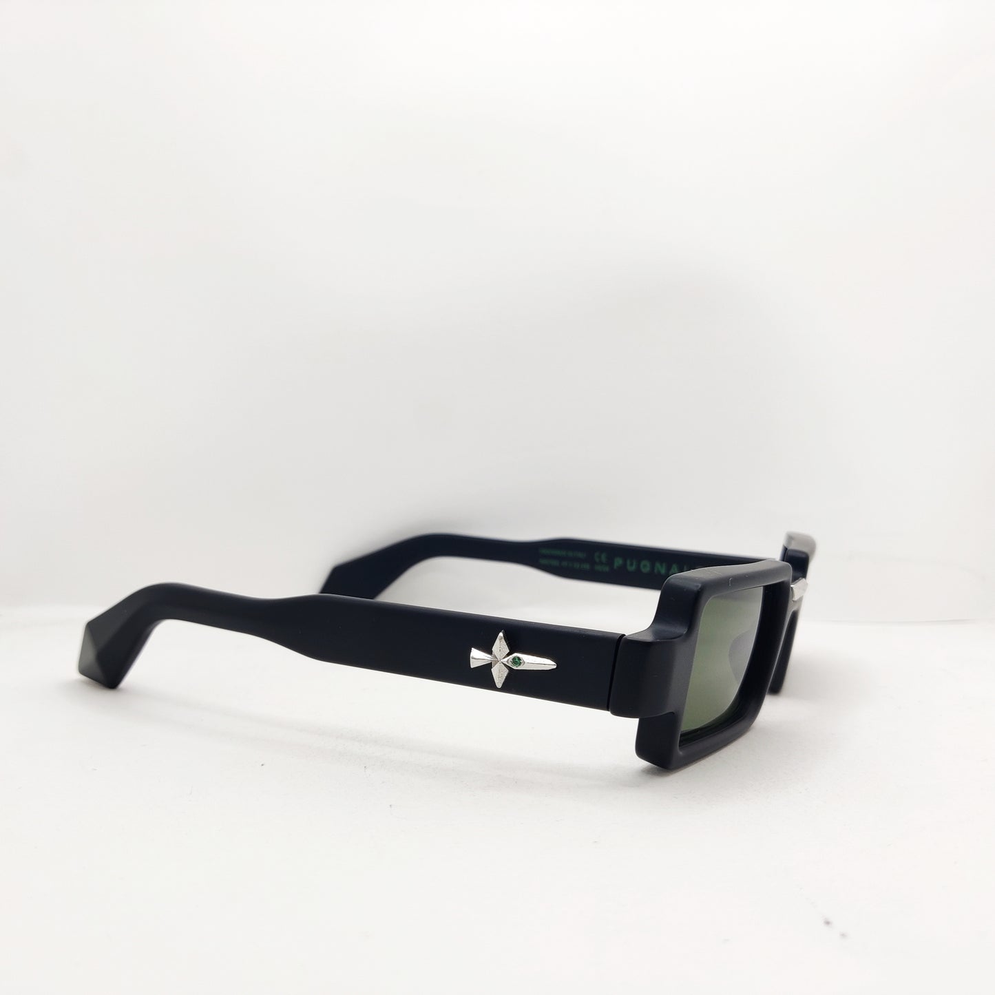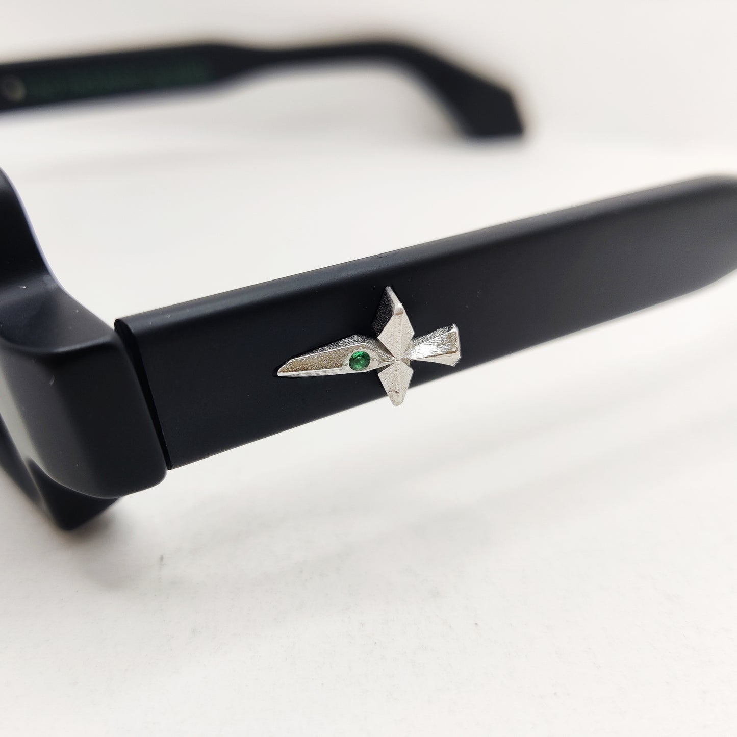 Materiale: Acetato, inserti in vero Argento con Smeraldi incastonati